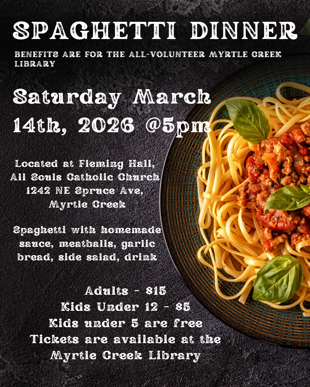 Please join us for a delicious Spaghetti Dinner at All Souls Catholic church to benefit community programs at the Myrtle Creek Library.