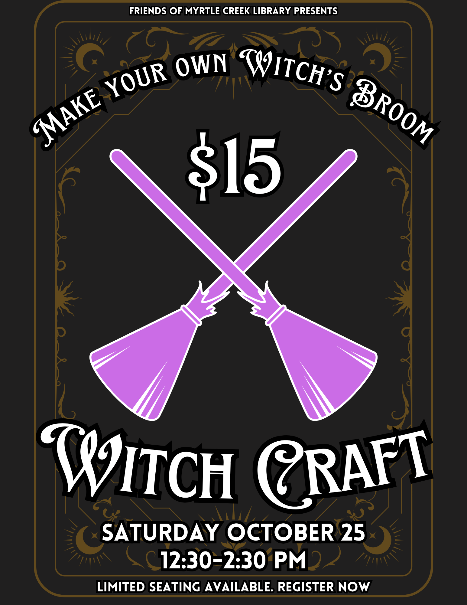 Friends of Myrtle Creek Library is hosting a traditional craft workshop where you can create your own Witch’s Broom. All the necessary materials are provided, including natural fibers, handles, and decorative elements needed to create a functional and aesthetically pleasing broom. We encourage you to bring your personal touch to add to your creation. such as keys, feathers, bells, trinkets, or charms to infuse your broom with a piece of your spirit.
