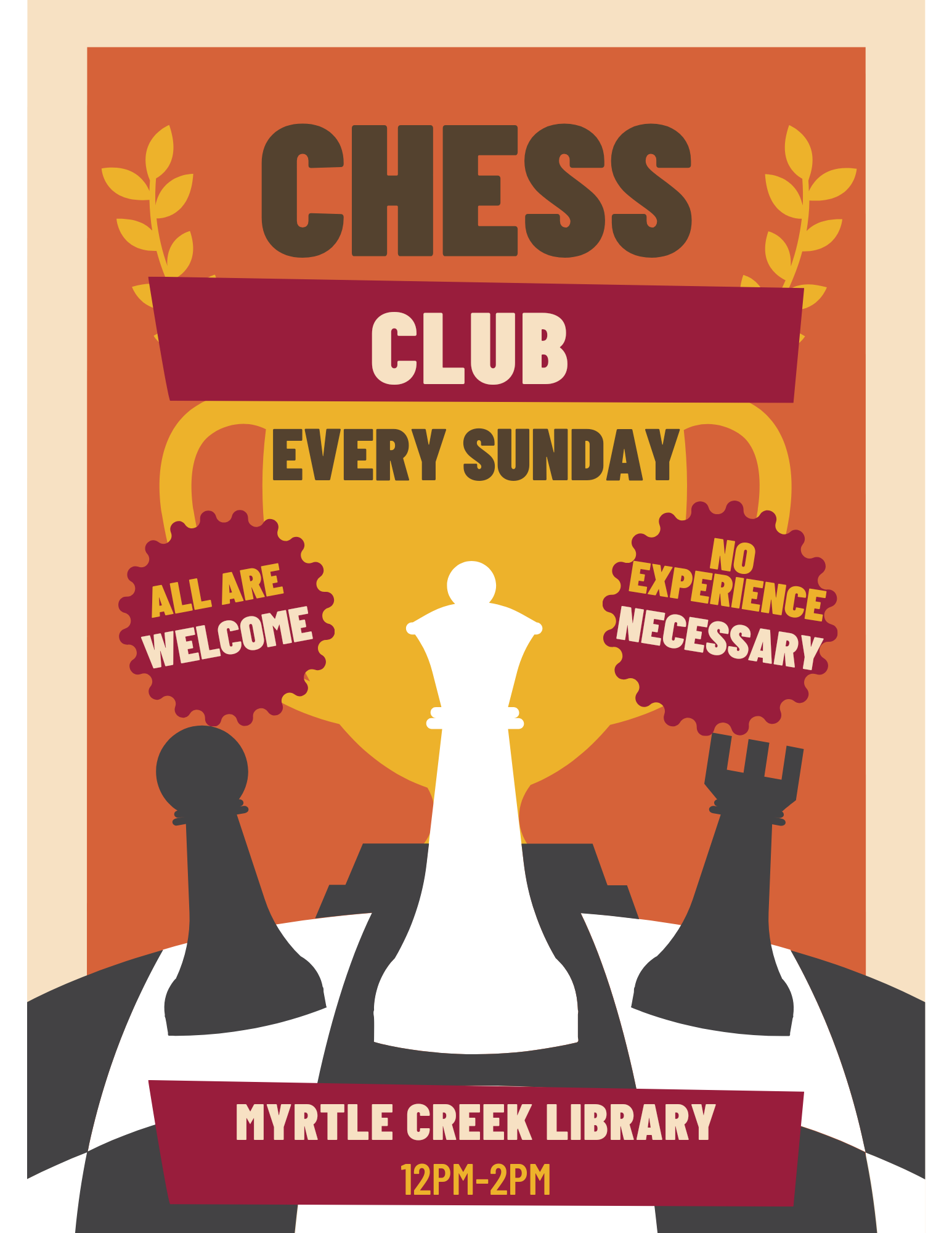 Join local chess enthusiasts for the Chess Club at Myrtle Creek Library every Sunday from 12 - 2 pm.