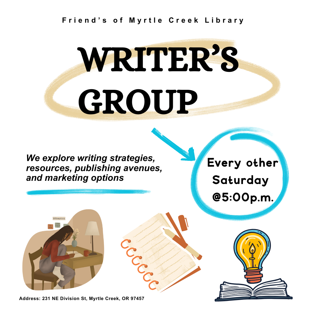 Friends of Myrtle Creek Library hosts a Writer’s Group on every other Saturday from 5 to 7 pm depending on availability; message Patty Kellison on Facebook or patty@fomcl.org to confirm. We discuss writing strategies, resources, publishing avenues, and marketing. Please join us! Everyone is welcome.