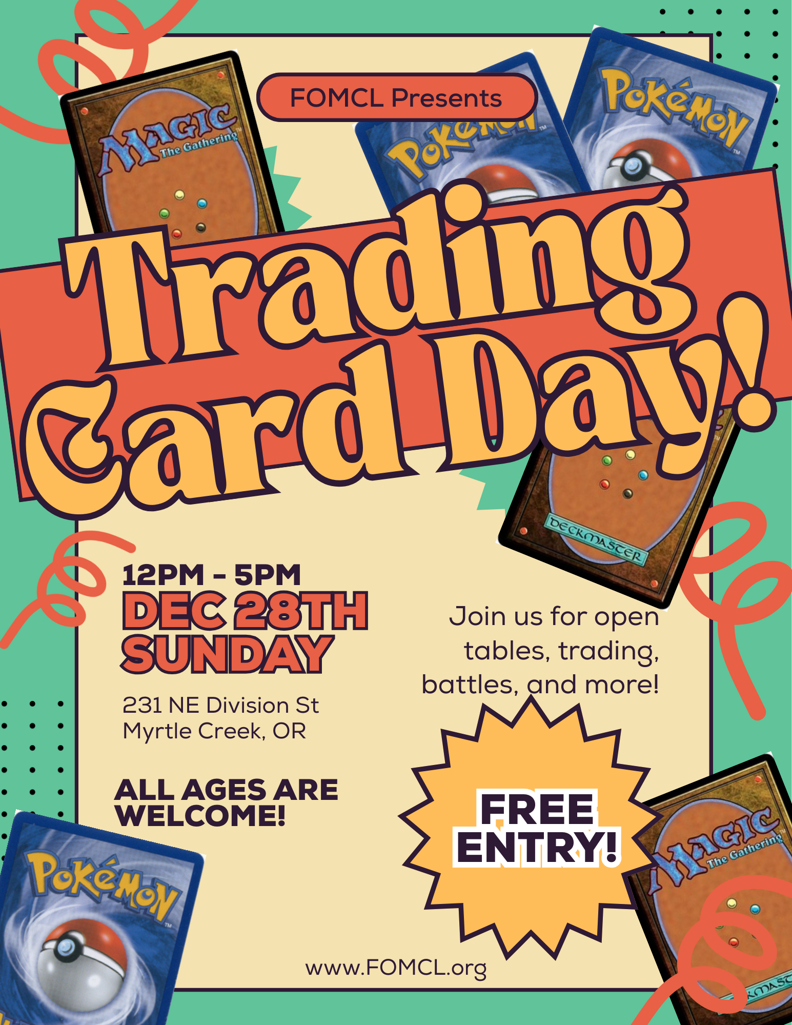 Join Friends of Myrtle Creek Library and other card enthusiasts for Trading Card Day at the library on Sunday, Dec 28 from 12 - 5pm. We will have open tables for trading, battles and more!