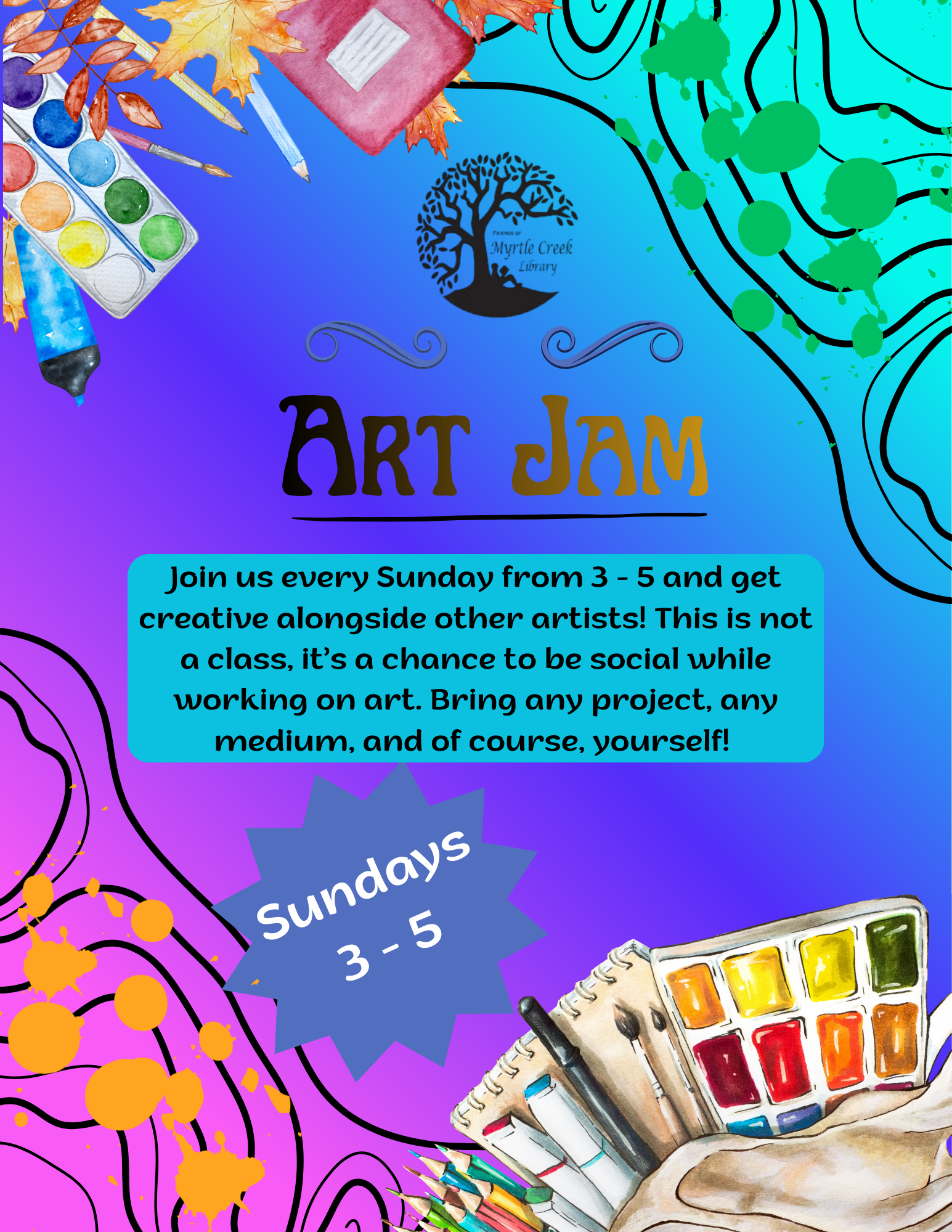 Calling all artists! Join Friends of Myrtle Creek LIbrary for an art jam session at the library. We generally meet every Sunday.