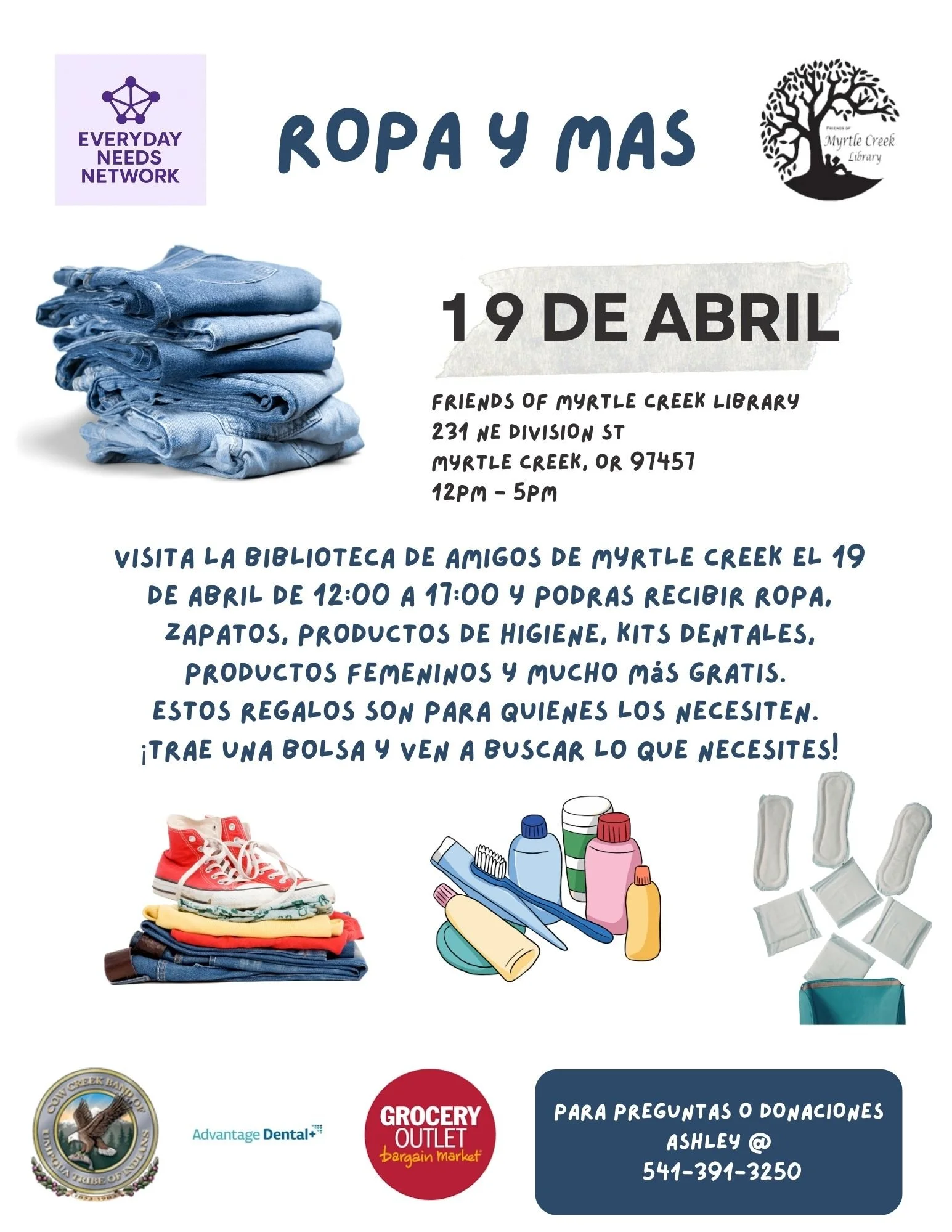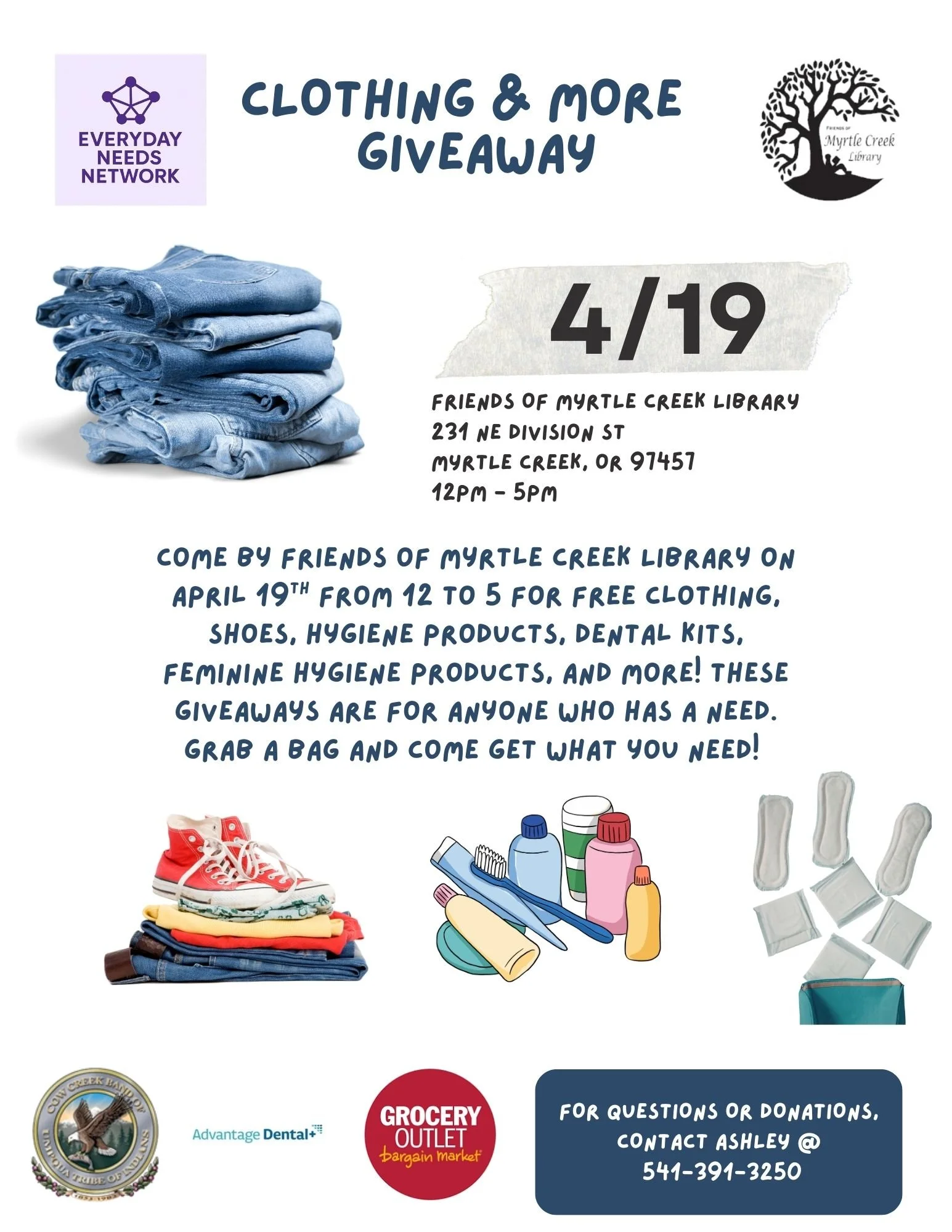 Clothing Giveaway! Sunday, April 19, 2026 12:00 PM 5:00 PM 12:00 17:00 Friends Of Myrtle Creek Library 231 NE Division St / PO Box 910 Myrtle Creek, OR, 97457 United States (map) Google Calendar ICS ***********************************************************************************