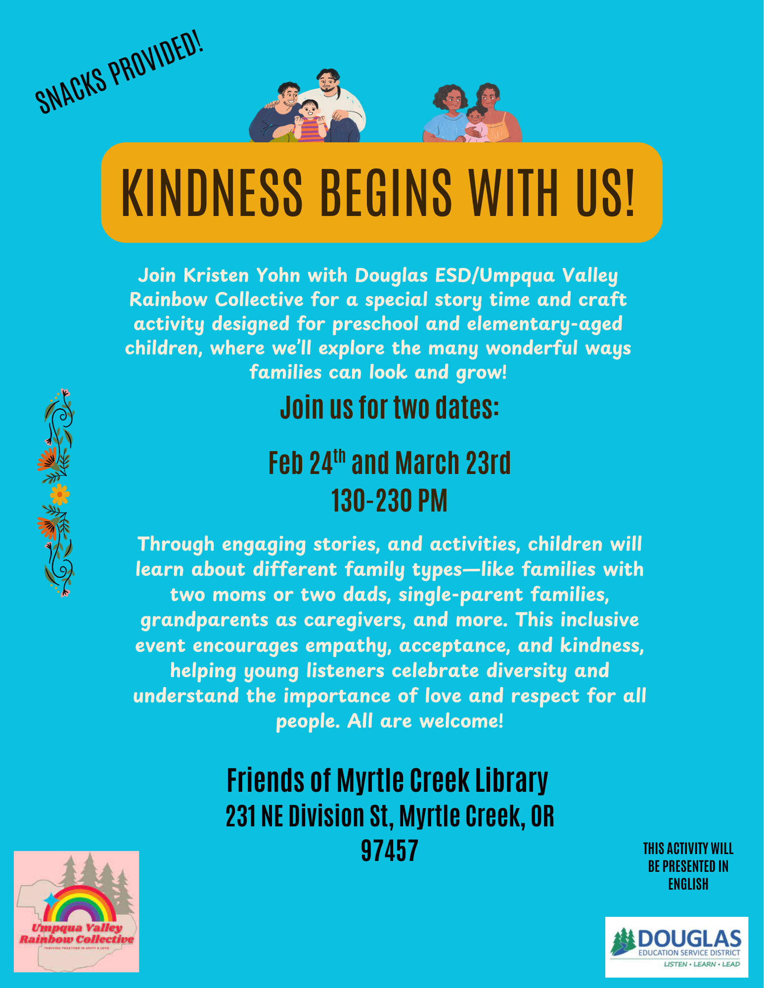 Friends of Myrtle Creek Library is hosting a special story time and craft activity designed for preschool and elementary-aged children on Monday 3/23 at 1:30pm.