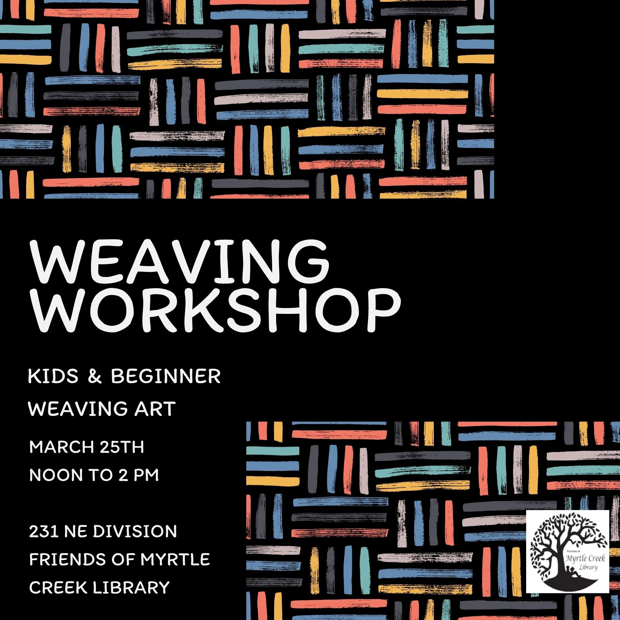 Weaving Art Workshop Wednesday, March 25, 2026 12:00 PM 2:00 PM 12:00 14:00 Friends Of Myrtle Creek Library 231 NE Division St / PO Box 910 Myrtle Creek, OR, 97457 United States (map) Google Calendar ICS Friends of Myrtle Creek Library is hosting a Weaving Workshop. This is a free event, geared toward kids and beginners.