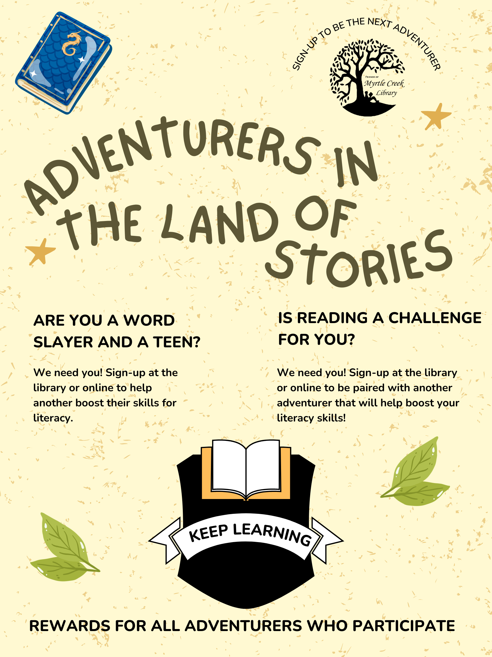 Hey kids and teens! Friends of Myrtle Creek Library are hosting a Wednesday afternoon series called Adventurers in the Land of Stories. This free series meets at 2pm on most Wednesdays from April 1 through July 29, and you can join us for any or all of the sessions.