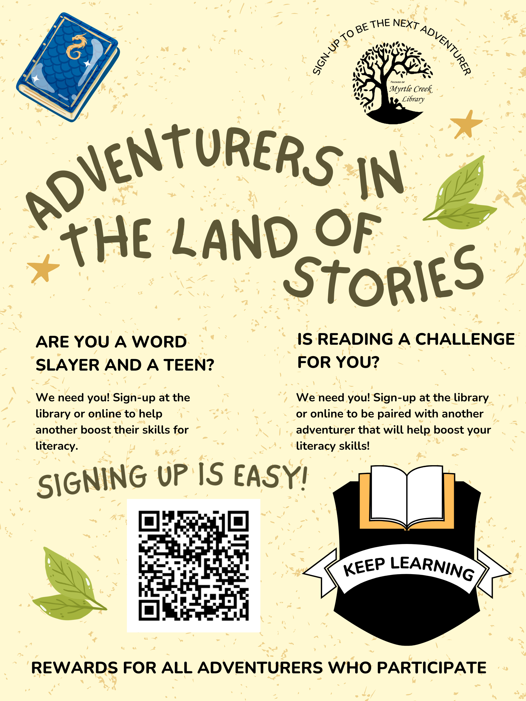 Hey kids and teens! Friends of Myrtle Creek Library are hosting a Wednesday afternoon series called Adventurers in the Land of Stories. This free series meets at 2pm on most Wednesdays from April 1 through July 29, and you can join us for any or all of the sessions.